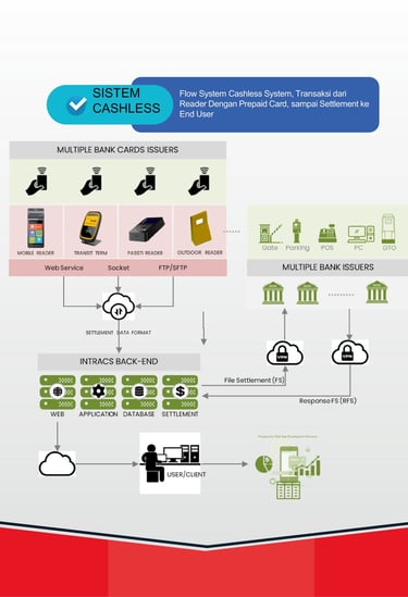 Transaksi parkir tanpa uang tunai dengan teknologi prepaid card dan settlement otomatis.